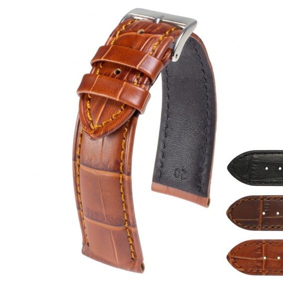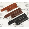 Ремешок выполнен из телячьей кожи с нанесенным на нее тиснением, имитирующим крупный узор кожи аллигатора.